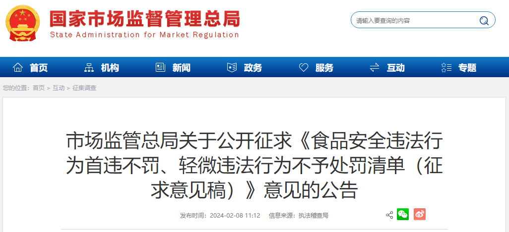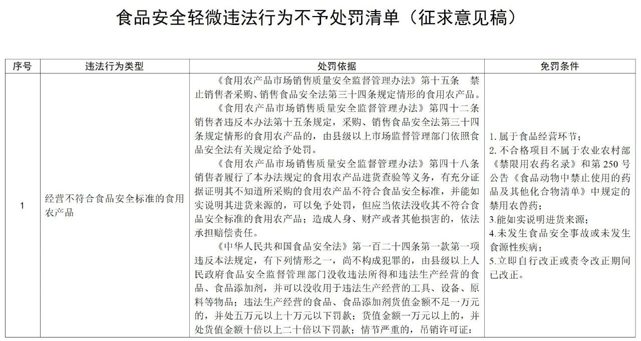为进一步优化营商环境,创新执法方式,市场监管总局总结全国食品安全执法实践,对食品安全违法行为实施首违不罚、轻微违法行为不予处罚,起草了《食品安全违法行为首违不罚清单(征求意见稿)》《食品安全轻微违法行为不予处罚清单(征求意见稿)》,向社会公开征求意见